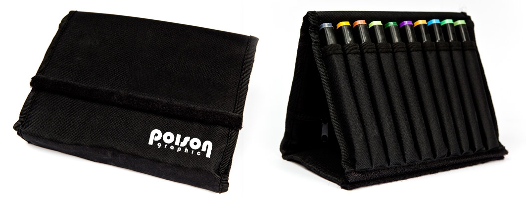 Countless hours and endless nights have gone into the development and design of the 'poison graphic' marker. Continuous testing and improvements were carried out to finally give the resulting highest quality marker that stands out through design and performance. The 60 carefully chosen colors are available either as a single marker or in sets, presented in a cool display-wallet.